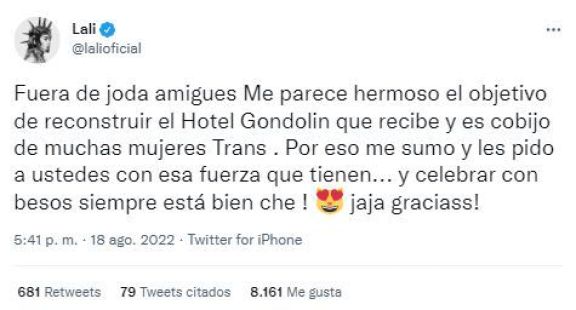 La cantante también detalló la idea en su cuenta de Instagram, y luego Twitteó: "Fuera de joda amigues Me parece hermoso el objetivo de reconstruir el Hotel Gondolin que recibe y es cobijo de muchas mujeres Trans . Por eso me sumo y les pido a ustedes con esa fuerza que tienen... y celebrar con besos siempre está bien che! jaja graciass!".
