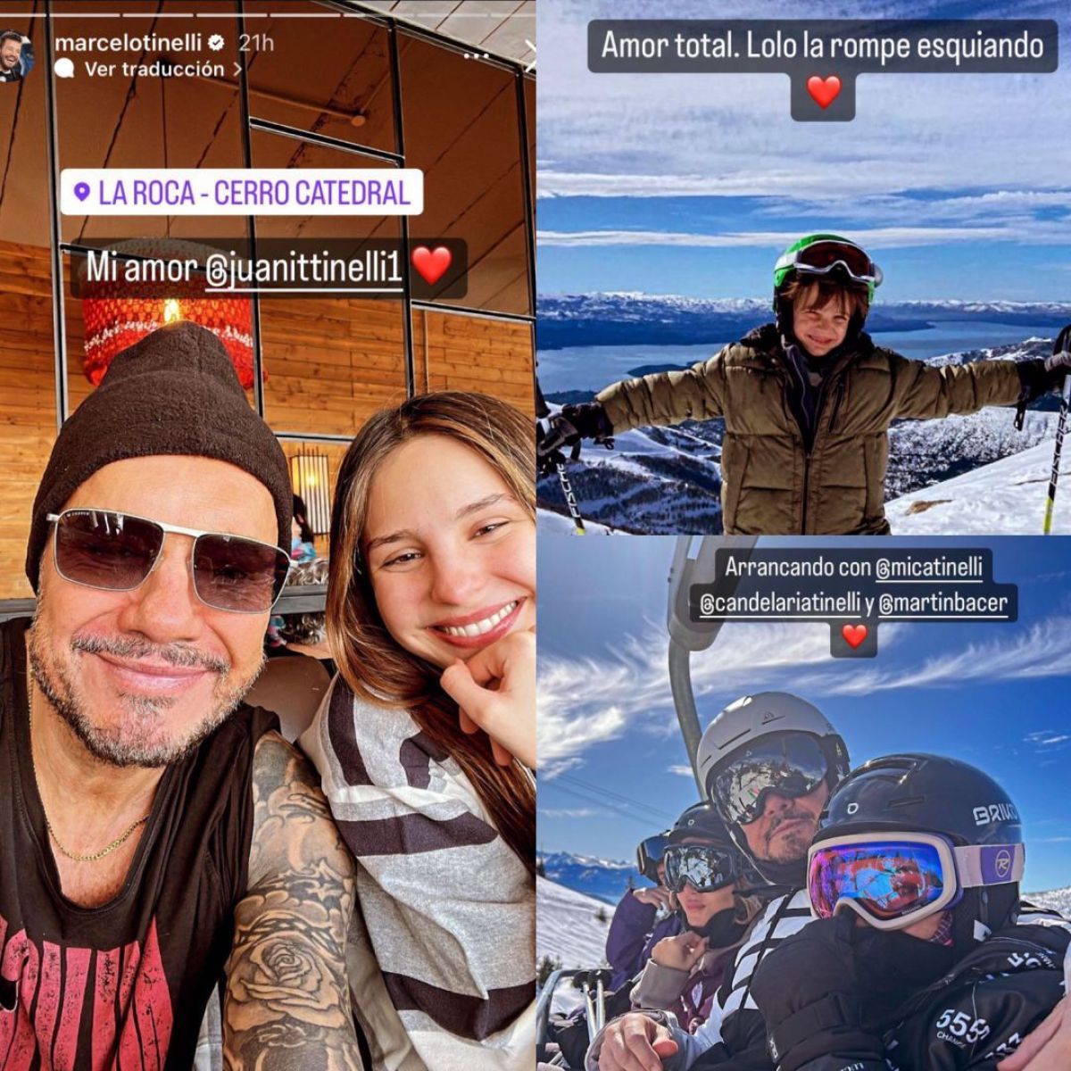 Marcelo compartió a través de sus historias, distintas postales en Bariloche junto a Mica, Cande, Juana, Fran y Lolo. “Amor total Lolo la rompe esquiando”, escribió en una de ellas.