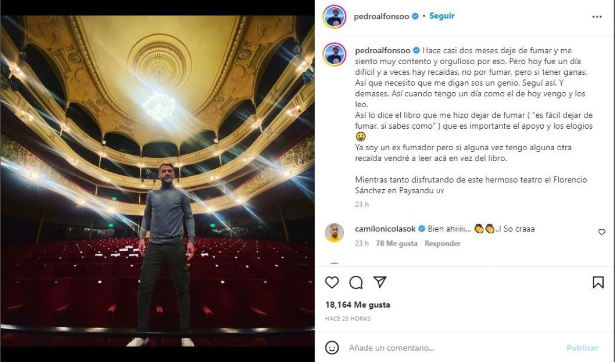 Por último, el actor aclaró: “Ya soy un ex fumador, pero si alguna vez tengo alguna otra recaída vendré a leer acá en vez del libro. Mientras tanto, disfrutando de este hermoso teatro, el Florencio Sánchez en Paysandú, Uruguay”.