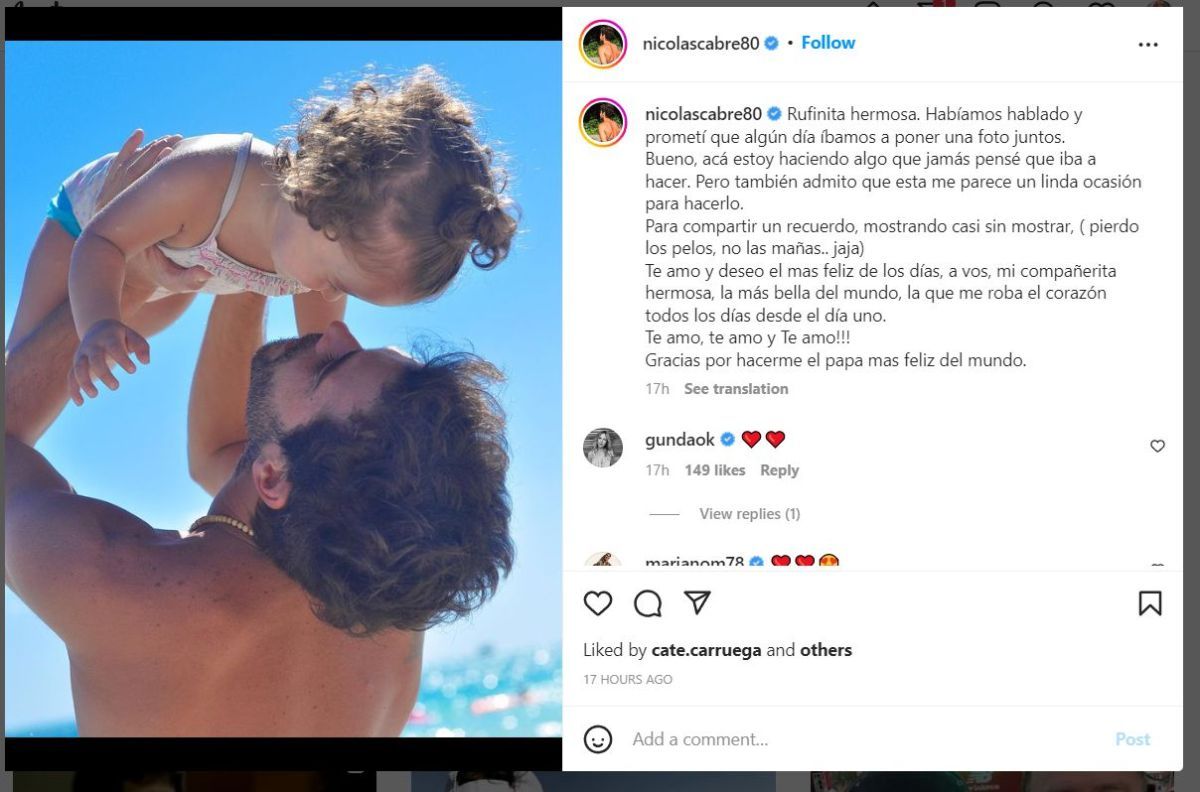 "Rufinita hermosa. Habíamos hablado y prometí que algún día íbamos a poner una foto juntos", comenzó Nicolás Cabré junto a una postal de cuando su hija era más pequeña.
