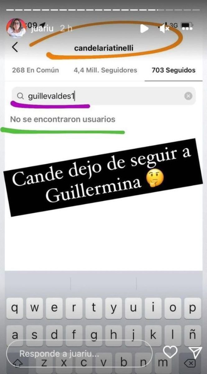 Lo descubrió la "detective de famosos" Juariu quien, al realizar una revisión de los seguidores de ambas mujeres, descubrió que ya no se seguían. “Cande dejó de seguir a Guillermina”, reveló la periodista sumando un emoji de una carita pensativa en sus historias de Instagram.