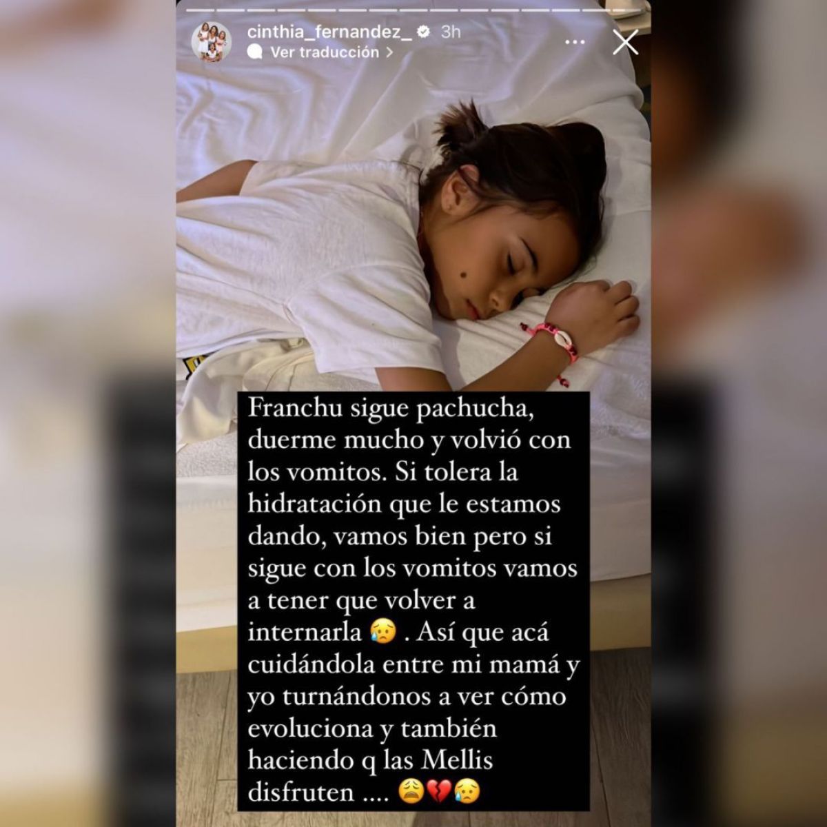 “Fran sigue pachucha. Duerme mucho y volvió con los vómitos, si tolera la hidratación que le estamos dando vamos bien pero si sigue con los vómitos vamos a tener que volver a internarla”, explicó en el posteo junto a una foto de su hija recostada en la cama.
