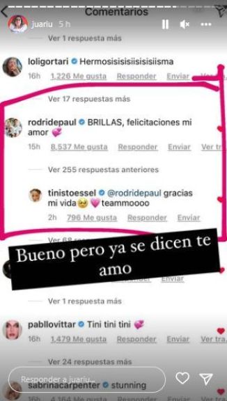 En la misma publicación, y contestando sutilmente las críticas recibidas por sus ambiguas declaraciones, la cantante le respondió: “Gracias mi vida. Te amo”. Juariu notó la interacción y la subió a sus historias, además acotó: “Bueno, pero ya se dicen te amo”.