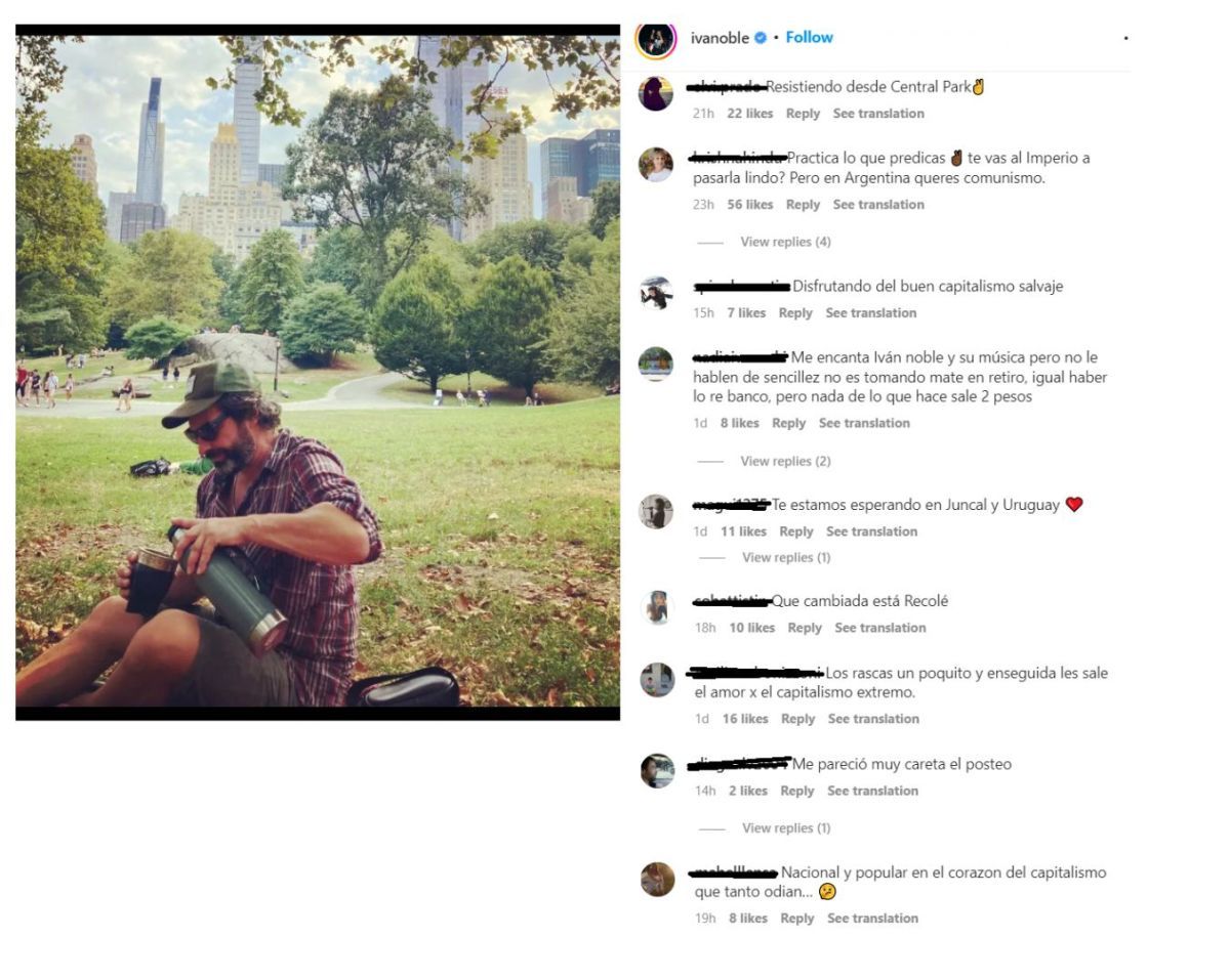 Pasados unos minutos, el artista recibió una lluvia de críticas: "Mercenario, te esperamos en Juncal", "¿Dónde compraste el dólar para fugar?", "Iván, ¿no estás en la marcha de apoyo a Cris? Ahhh nooooo, cierto que estás en el epicentro del capitalismo fugando divisas", "La doble vara, no falla nunca", "Me encanta que estés allá... más me encantaría que no volvieras nunca más"; "Resistiendo desde el Central Park"; "Che, fugador, el aguante era en Recoleta", fueron algunos de los comentarios que los usuarios hicieron en Instagram.