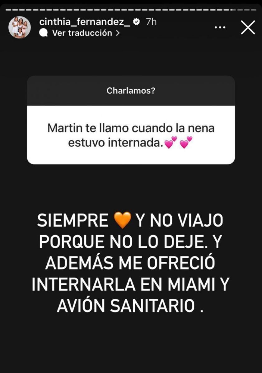 “No viajó porque no lo dejé. Además me ofreció internarla en Miami y un avión sanitario”, expresó Cinthia en sus historias de Instagram y dijo que él la había llamado en todo momento.