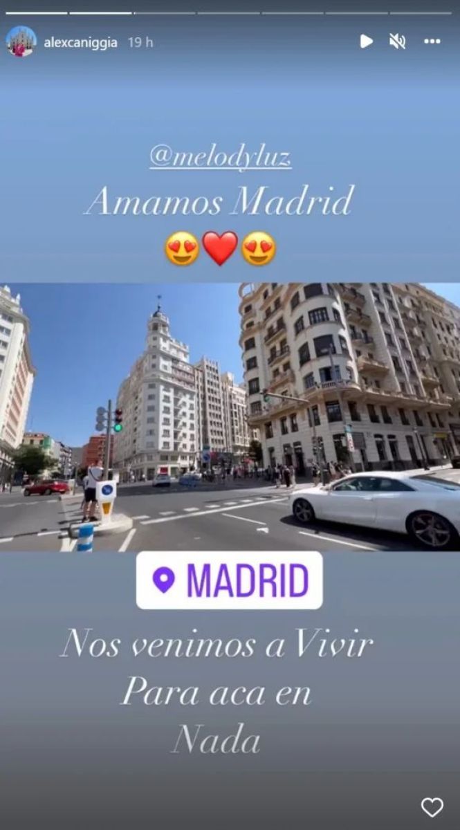 Tanto Alex como Melody expresaron que les gustó tanto Madrid que no descartan la posibilidad de convivir en la ciudad europea. A través de sus stories de Instagram Alex indicó: "Siempre juntos, amor de mi vida". "Amamos Madrid, nos venimos a vivir para acá en nada", contó Alex en otra storie, ilusionado.