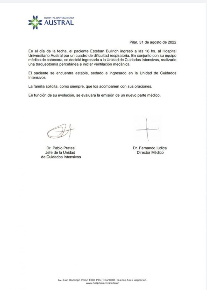 Su parte médico señala que “en el día de la fecha, el paciente Esteban Bullrich ingresó a las 16 al Hospital Universitario Austral por un cuadro de dificultad respiratoria”. Y asegura: “En conjunto con su equipo médico de cabecera, se decidió ingresarlo a la Unidad de Cuidados Intensivos, realizarle una traqueotomía percutánea e iniciar ventilación mecánica”.