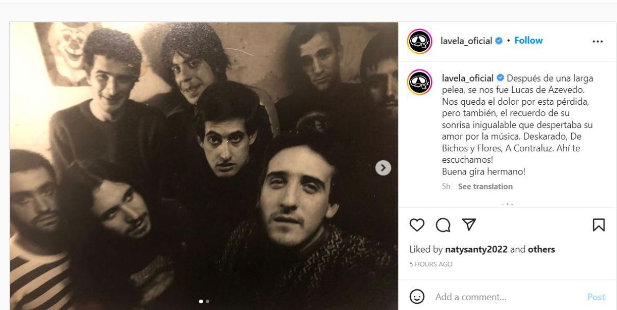 "Después de una larga pelea, se nos fue Lucas de Azevedo. Nos queda el dolor por esta pérdida, pero también, el recuerdo de su sonrisa inigualable que despertaba su amor por la música", comunicó @lavela_oficial.