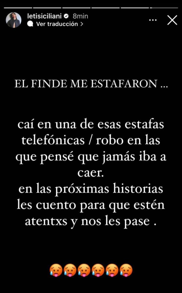 La actriz Leticia Siciliani subió un descargo a sus historias de instagram contando que había sufrido una estafa virtual y explicó cómo le habían vaciado su cuenta bancaria. "El finde me estafaron... Caí en uno de esos robos en los que pensé que jamás iba a caer", escribió.