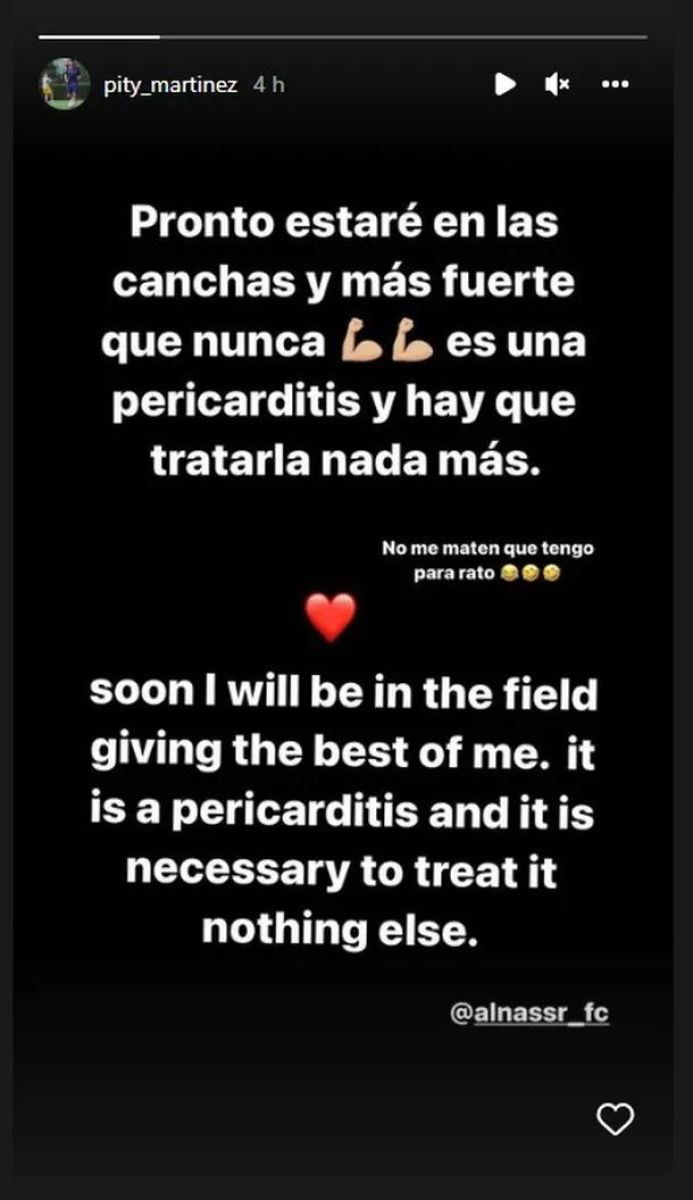 Desde su cuenta de Twitter oficial, el periodista Roy Nemer comentó: "Pity Martínez, que juega en el Al-Nassr del Reino de Arabia Saudí, tiene un problema cardíaco. Es probable que su contrato sea rescindido".