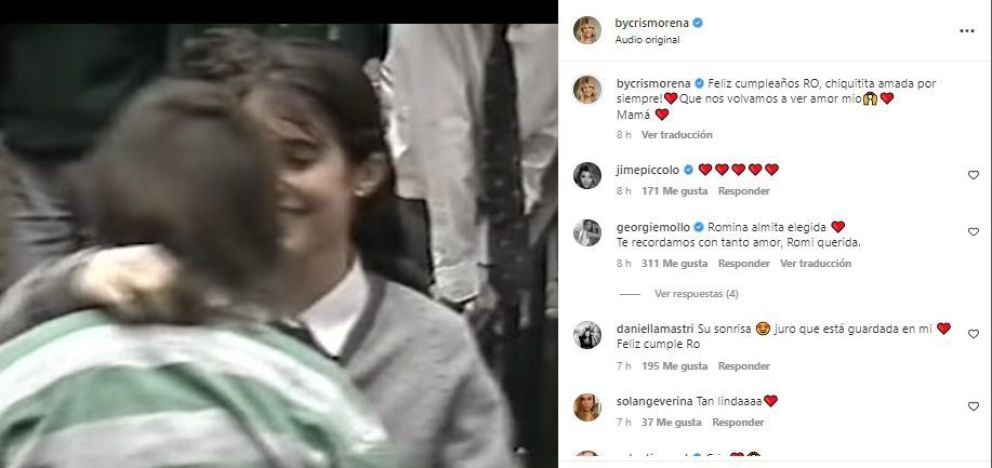 Cris Morena recordó con inmenso amor a su hija, Romina. La productora de tiras infantiles le dedicó un dulce posteo: "Feliz cumpleaños Ro, chiquitita amada por siempre. Que nos volvamos a ver amor mío. Mamá". También, Gustavo Yankelevich en su cuenta de Instagram publicó junto a una foto con su hija: "Ro de mi vida,sos mi faro,sos mi luz,cada día te amo más"