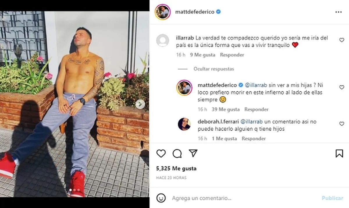 En este contexto, el futbolista respondió contundente a una usuaria de Instagram que le recomendó que se vaya del país por los escándalos con su ex."¿Sin ver a mis hijas? Ni loco. Prefiero morir en este infierno, al lado de ellas... ¡Siempre!", sentenció Matías.