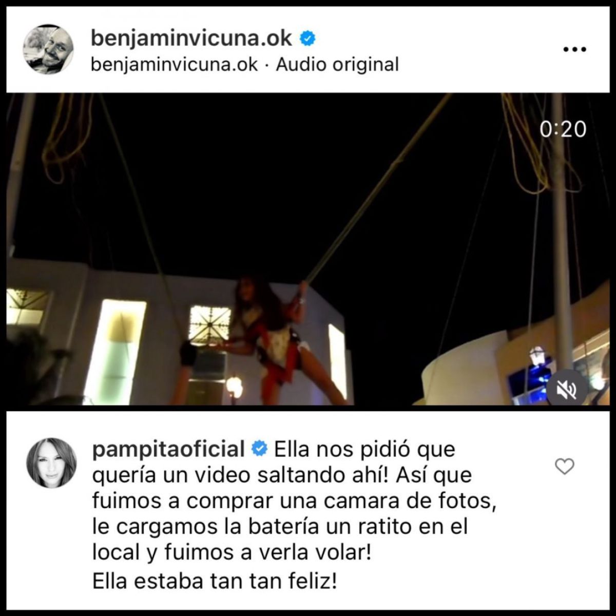 “Ella nos pidió que quería un video un video saltando ahí. Así que fuimos a comprar una cámara de fotos, le cargamos la batería un ratito en el local y fuimos a verla volar. ¡Ella estaba tan feliz!”, escribió Pampita ya qué Vicuña había publicado un video de Blanca saltando en una cama elástica.