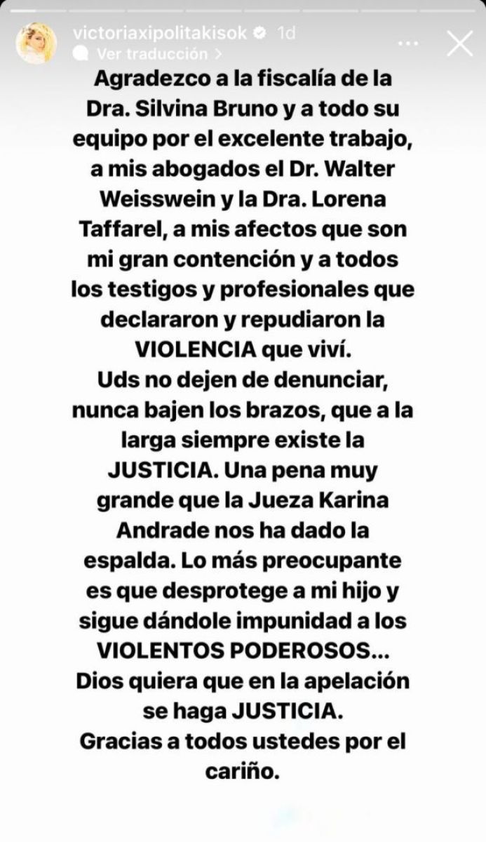 Vicky también agradeció a todo su equipo de abogados y concluyó: “Lo más preocupante es que desprotege a mi hijo y sigue dándole impunidad a los violentos poderosos. Dios quiera que en la apelación se haga Justicia. Gracias a todos ustedes por el cariño”.