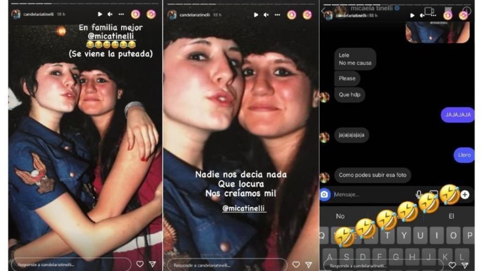 “Nos creíamos mil”, escribió Cande junto a la foto. Minutos más tarde, compartió una captura del chat con su hermana en donde se podía leer que ella le decía: “Lele, no me causa. Como podes subir esa foto”.