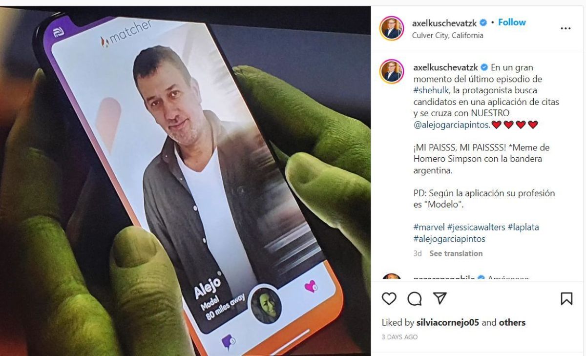 "En un gran momento del último episodio de #shehulk, la protagonista busca candidatos en una aplicación de citas y se cruza con NUESTRO @alejogarciapintos. ¡MI PAISSS, MI PAISSSS! *Meme de Homero Simpson con la bandera argentina. PD: Según la aplicación su profesión es "Modelo", publicó.