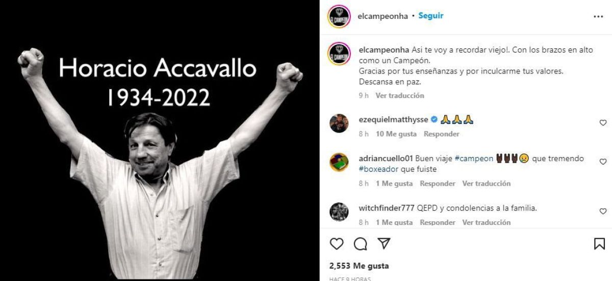 Así lo comunicó en su cuenta de Instagram, Horacio Accavallo Jr, junto a unas palabras de despedida para su padre: "Así te voy a recordar viejo!. Con los brazos en alto como un Campeón. Gracias por tus enseñanzas y por inculcarme tus valores. Descansa en paz".