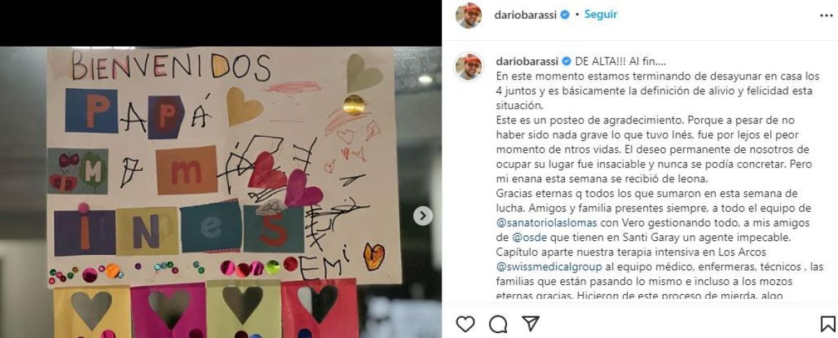 "DE ALTA!!! Al fin…En este momento estamos terminando de desayunar en casa los 4 juntos y es básicamente la definición de alivio y felicidad esta situación. Este es un posteo de agradecimiento. Porque a pesar de no haber sido nada grave lo que tuvo Inés, fue por lejos el peor momento de nuestras vidas”, escribió Darío.