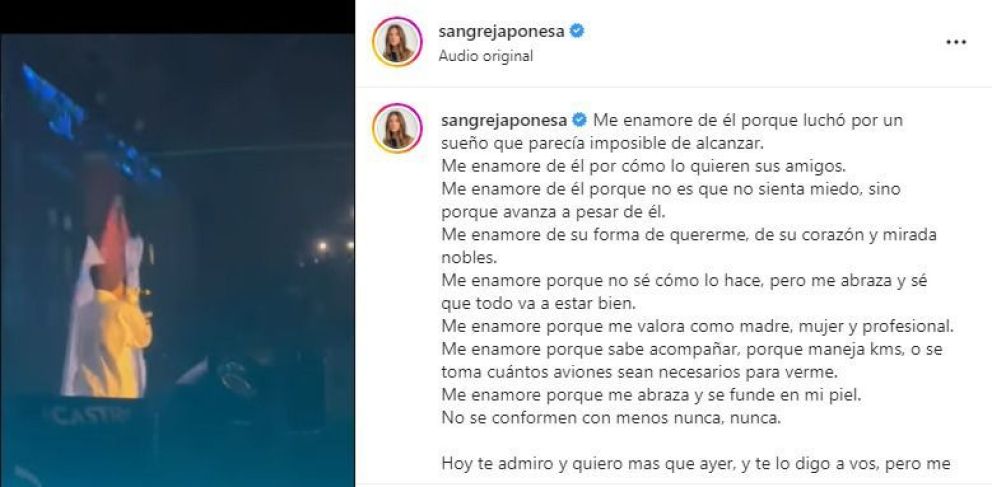 Dentro del mismo posteo, también la cantante le aconsejó a sus seguidores: "Me enamoré porque me valora como madre, mujer y profesional. Me enamoré porque sabe acompañar, porque maneja kilómetros o se toma cuántos aviones sean necesarios para verme. Me enamoré porque me abraza y se funde en mi piel. No se conformen con menos nunca, nunca".