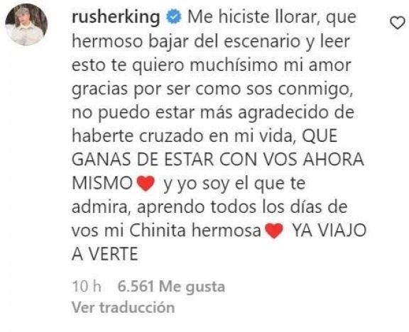 El cantante admitió que sus palabras lo sensibilizaron, al ver que la actriz había posteado un video del artista brillando sobre el escenario junto a un sentido texto inspirado en él. "Me hiciste llorar, qué hermoso bajar del escenario y leer esto; te quiero muchísimo mi amor, gracias por ser como sos conmigo", expresó el artista.