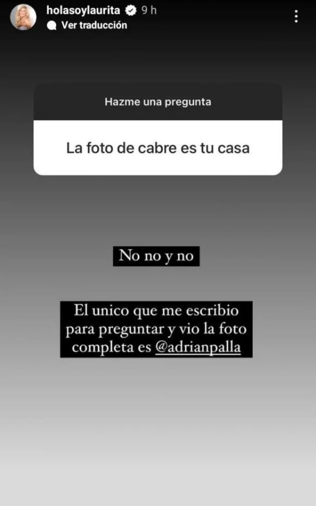 Desde una storie en su cuenta de Instagram, uno de sus seguidores le consultó a Laurita sobre su posible reconsiliación: "¿La foto de Cabré es tu casa?". A lo que la actriz contestó: "No, no y no... El único que me escribió para preguntarme y vio la foto completa fue Adrián Pallares".