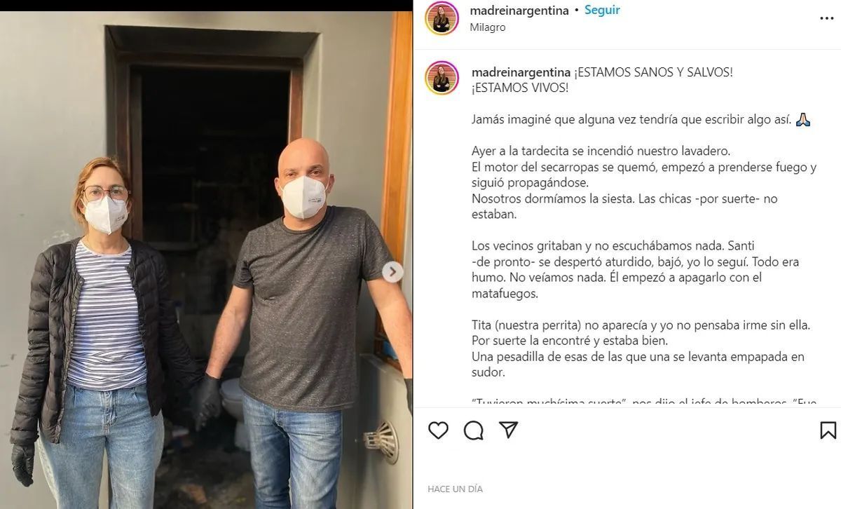 “Las chicas por suerte no estaban -haciendo referencia a sus hijas-, los vecinos gritaban y no escuchábamos nada. Santi de pronto se despertó aturdido, bajó, yo lo seguí. Todo era humo. No veíamos nada. Fue una pesadilla de esas de las que una se levanta empapada en sudor”, resumió y finalizó: “La vida es un regalo precioso. Gracias, Universo, por dejarnos seguir acá”.