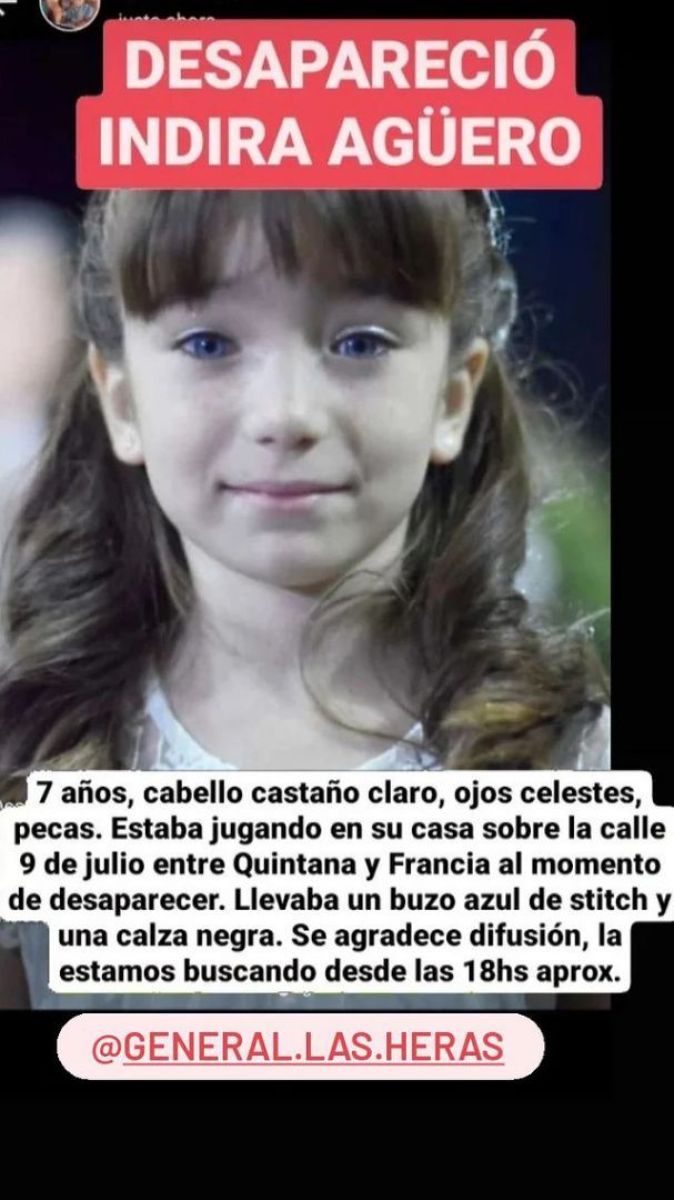 La policía de General Las Heras confirmó la aparición de Indira Agüero, la niña de 7 años que desde las 18 horas era buscada intensamente en toda la región.
