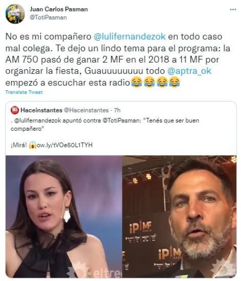Desde su cuenta de Twitter, el periodísta citó una nota de 'Haceinstantes' y fulminó a la panelista: "No es mi compañero Luli Fernández, en todo caso mal colega. Te dejo un lindo tema para el programa: la AM 750 pasó de ganar 2 MF en el 2018 a 11 MF por organizar la fiesta, Guau todo 'aptra_ok' empezó a escuchar esta radio".