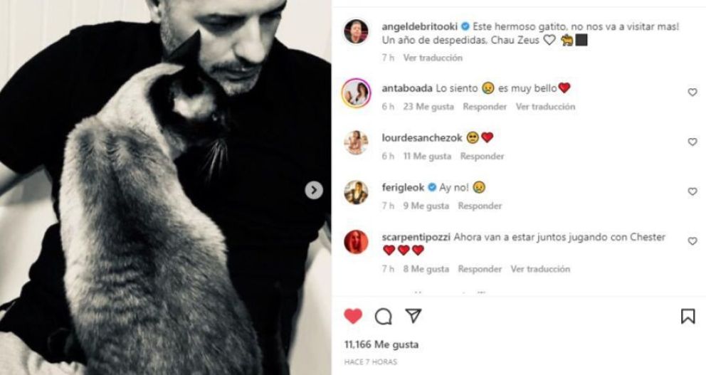 "Este hermoso gatito no nos va a visitar más. Un año de despedidas, Chau Zeus", escribió Ángel junto a una seguidilla de tiernas fotos junto a su mascota.