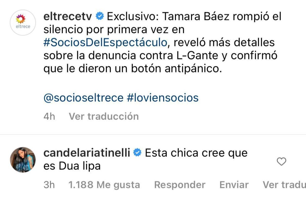 Luego de que Tamara Báez diera un móvil ante las cámaras de Socios del Espectáculo acerca de su conflicto con L-Gante, Candelaria Tinelli dejó un comentario filoso contra la ex del cantante.