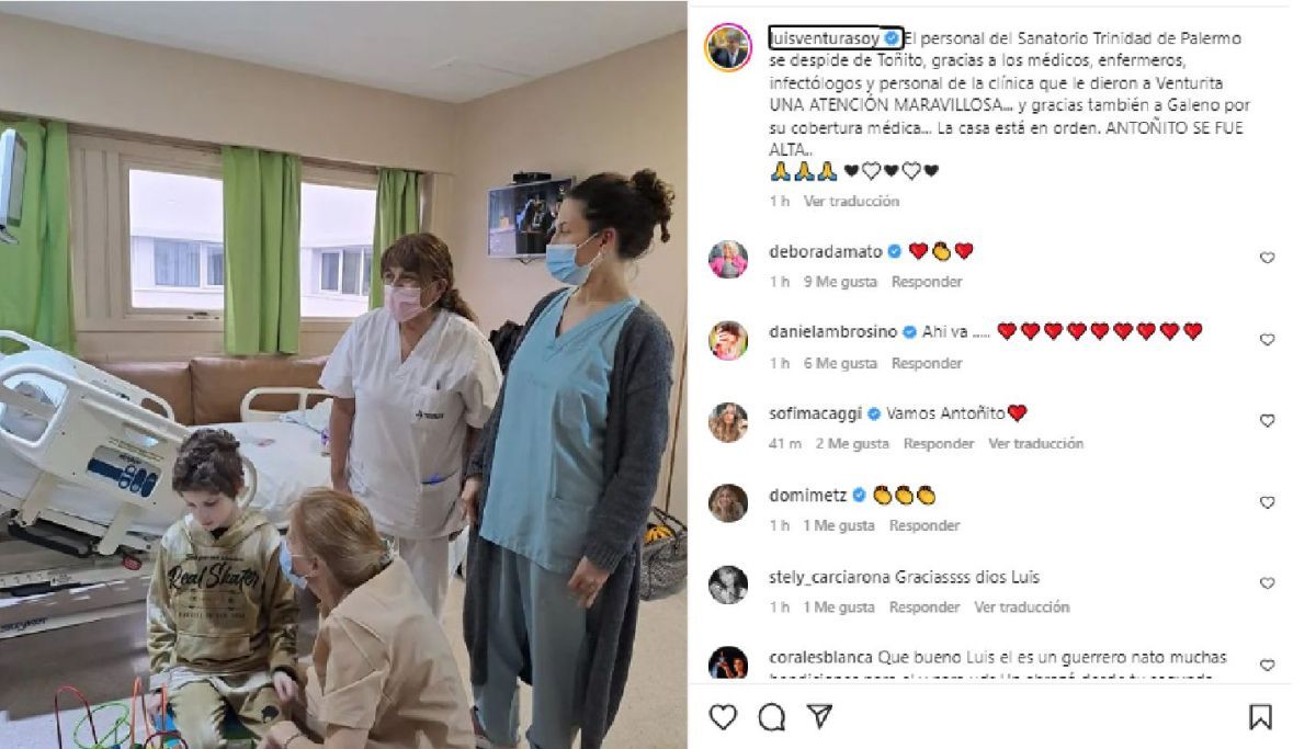 Pero este sábado, Ventura contó en su cuenta de Instagram que su hijo de ocho años, a quien tuvo junto a Fabiana Liuzzi, recibió el alta médica y ya se pudo ir a su casa.