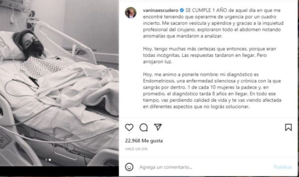 La bailarina Vanina Escudero compartió un conmovedor posteo en donde recordó la internación por la cuál pasó en octubre del año pasado. "Hoy, me animo a ponerle nombre: mi diagnóstico es Endometriosis, una enfermedad silenciosa y crónica con la que sangrás por dentro", detalló.