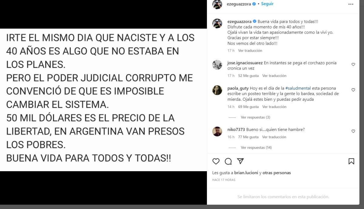 "Pero el Poder Judicial corrupto me convenció de que es imposible cambiar el sistema, 50 mil dólares es el precio de la libertad. En Argentina van presos los pobres. Buena vida para todos y todas!!", agregó Guazzora, de quien se afirma que atraviesa un período de depresión.