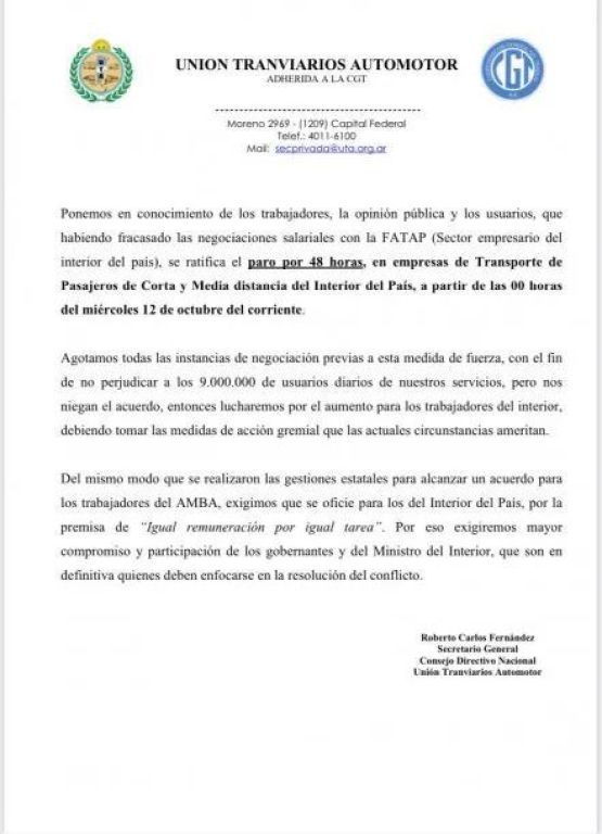 El secretario general de la UTA indicó: “Hemos agotado todas las instancias de negociación en procura de la paz social, a fin de no perjudicar a los usuarios de nuestros servicios en el interior del país, pero debemos luchar por el salario de los trabajadores y por un aumento que es reconocido por los empresarios pero los gobernantes desconocen, obligándonos a tomar las medidas”.
