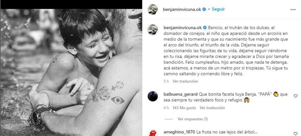 “Benicio, el truhán de los dulces, el domador de conejos, el niño que apareció desde un arcoiris en medio de la tormenta y que su nacimiento fue más grande que el arco del triunfo, el triunfo de la vida", comenzó escribiendo junto a una foto de ambos.