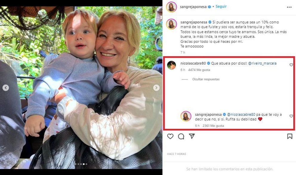 Acto seguido, Nico le dedicó unas lindas palabras a la abuela de su hija y escribió: "Que abuela por dios", arrobando a su exsuegra. En respuesta, La China le puso: "@nicolascabre80 pa que te voy a decir que no, si si. Rufita su debilidad", finalizó.