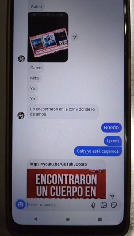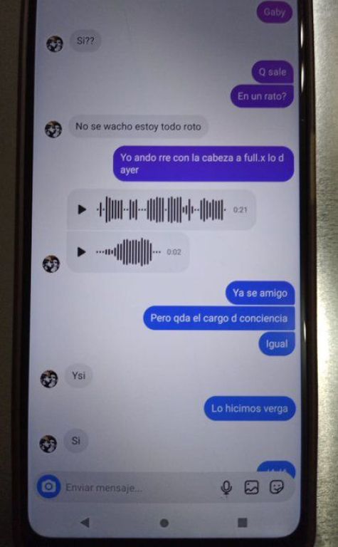 En las imágenes se llega a ver que, el imputado 1 envió dos mensajes de audio y la respuesta fue: "Ya sé amigo. Pero queda el cargo de conciencia. Igual". Al haber una afirmación, el imputado 2 deslizó con frialdad: "Lo hicimos ver...".