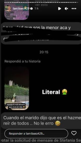 Por último, compartió un comentario de un usuario que lanzó la frase “Cuando el marido dijo que es el hazmerreír de todos, no le erro”, Báez cerró, sin filtro y con otro emoji de una carita vomitando le respondió: “Literal”.