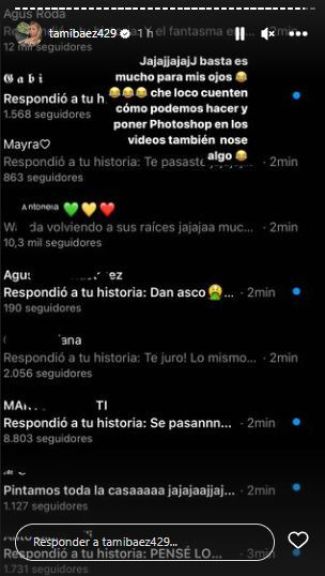 “Jajajaja, lo más bizarro que vi en mi vida”, fue lo primero que escribió la joven en sus historias de Instagram. Luego, mostró la cantidad de mensajes de sus seguidores apoyándola y criticando a la hermana de Zaira Nara: “Jajaja. Basta, es mucho para mis ojos. Che, loco, cuenten cómo podemos hacer y poner Photoshop en los videos también. No sé, algo”, expresó irónica.