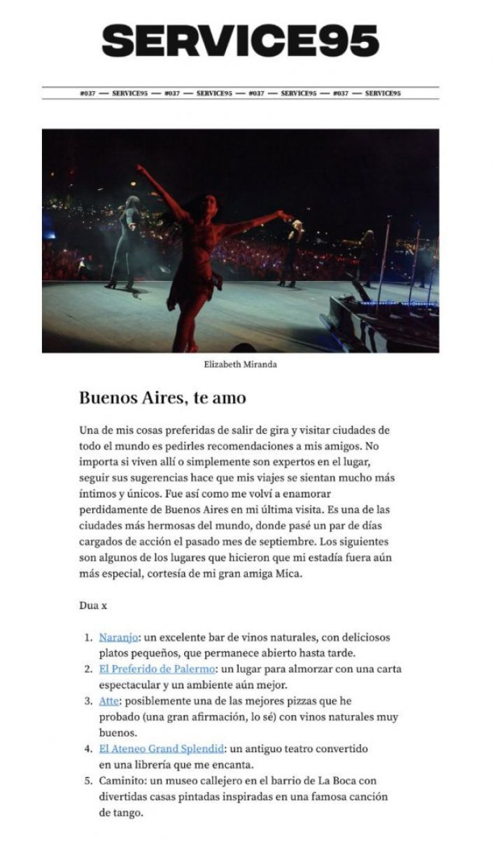 A un mes de los conciertos de Dua Lipa en Buenos Aires, la cantante recordó su paso por la ciudad y publicó en su newsletter una reseña con sus lugares favoritos.