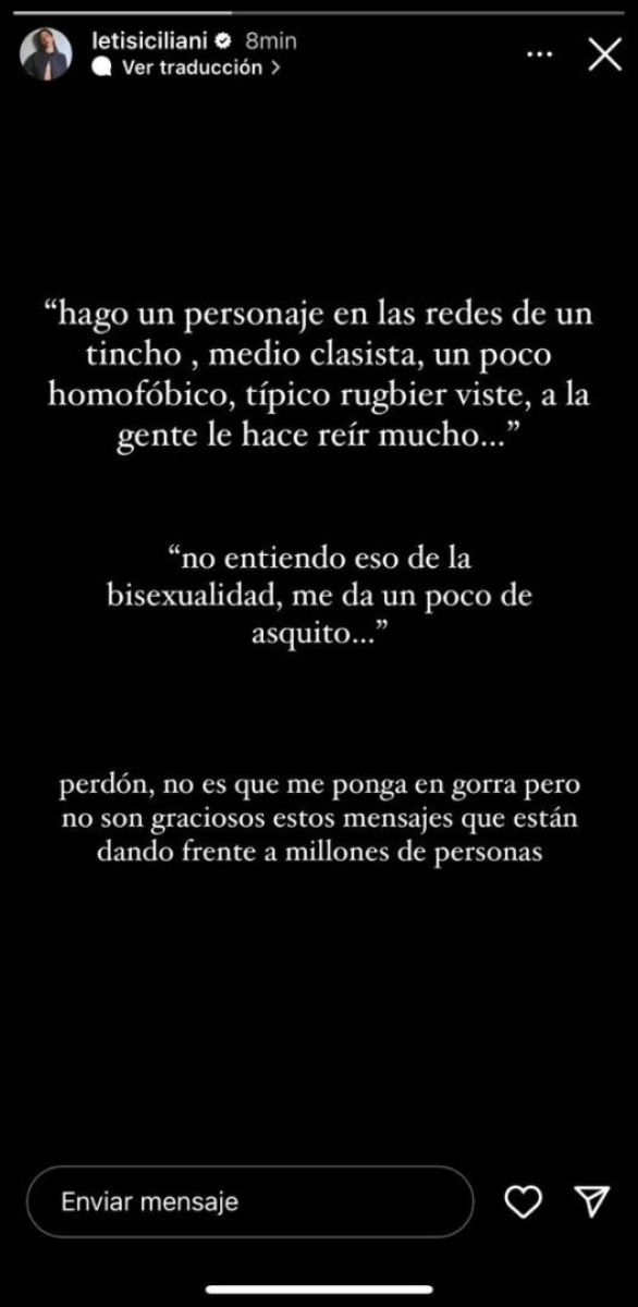 "'Hago un personaje en las redes de un tincho, medio clasista, un poco homofóbico, típico rugbier viste, a la gente le hace reír mucho'; 'no entiendo eso de la bisexualidad, me da un poco de asquito'", escribió Siciliani para destacar los comentarios que más le molestaron.