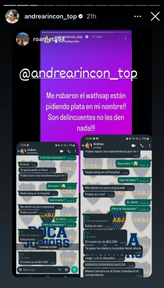 “Me robaron el whatsapp, están pidiendo plata en mi nombre. Son delincuentes no les den nada”, publicó Rincón en un primer momento y mostró imágenes de cómo estaban operando en los chats. Luego contó que había podido solucionar y explicó: “Me parece decirles a mis contactos que se avispen. Pudimos desbloquear rápido el WhatsApp, pero esta gente no se da por vencida y está llamando a mis contactos”.