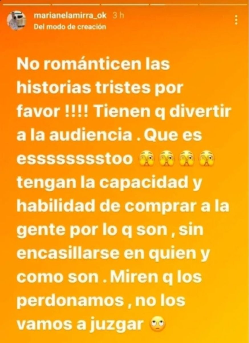 La ex de Andrés Calamaro se expresó en Instagram y dejó bien en claro que no verá el gran show. "¡No romanticen las historias tristes por favor! ¡Tienen que divertir a la audiencia! ¿Qué es esto?", escribió en una historia.