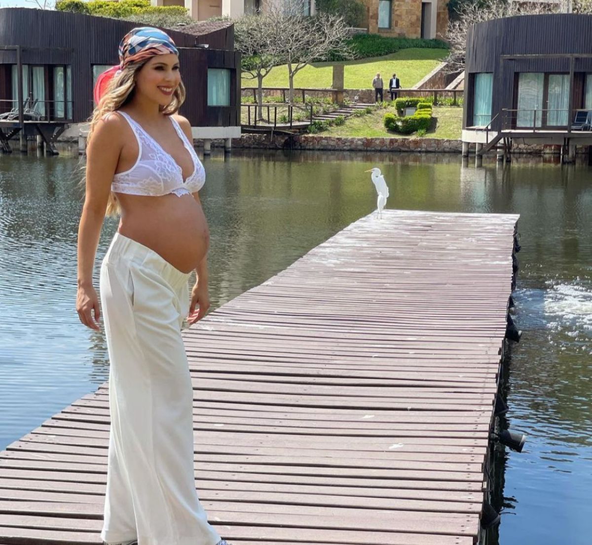 En la imagen, la modelo se mostró con un pantalón de color blanco y un corpiño de encaje que permitía dejar su pancita al descubierto, y con un colorido pañuelo en la cabeza para completar el look.