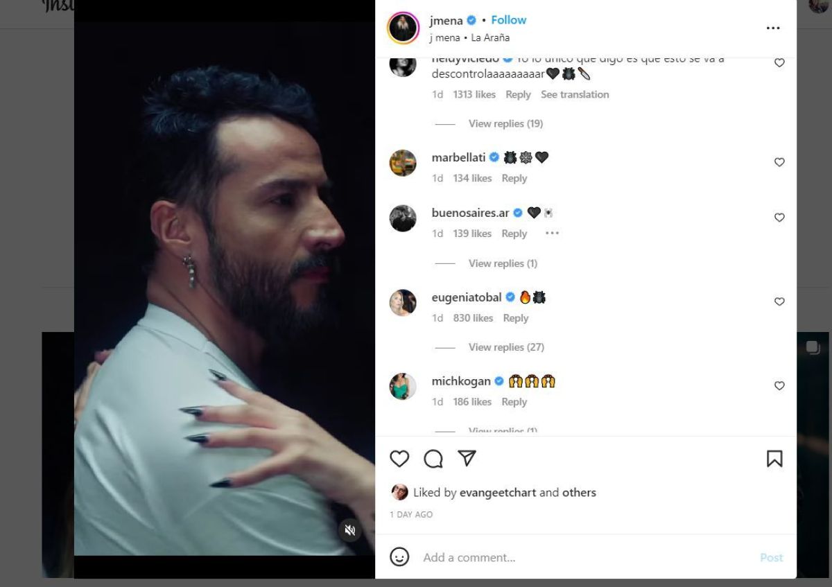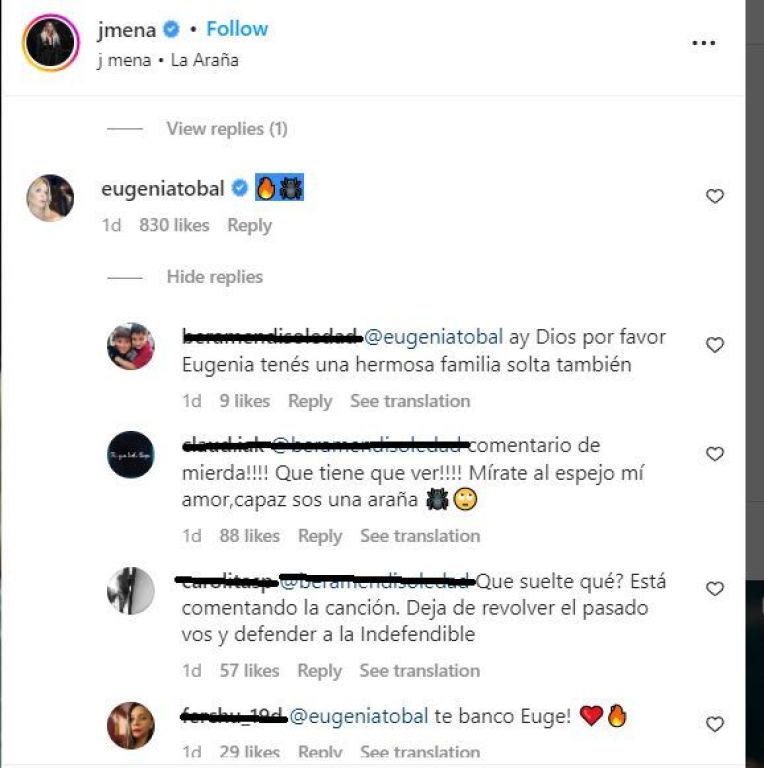 A través de sus redes sociales, recibió todo el apoyo de sus seguidores y de otros colegas, y entre los comentarios que se hicieron notar, estuvo el de la actriz Eugenia Tobal, quien le dejó un 🔥🕷️ en el fragmento del video en Instagram.