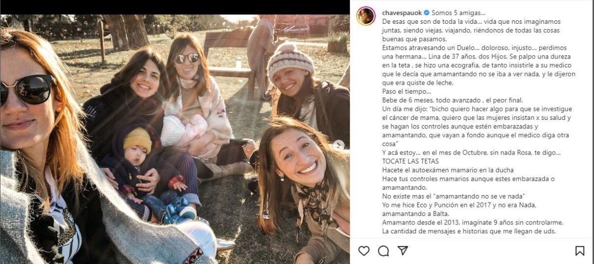 Desde su cuenta de Instagram, la conductora comenzó relatando: "Somos 5 amigas, de esas que son de toda la vida. Hoy estamos atravesando un duelo doloroso, injusto… perdimos a una hermana: Lina de 37 años con dos hijos". Luego agregó: "Se palpó una dureza en la teta, se hizo una ecografía y de tanto insistirle a su médico, que le decía que amamantando no se iba a ver nada, le dijeron que era quiste de leche. Pasó el tiempo. Con un bebé de 6 meses, todo avanzado , el peor final".