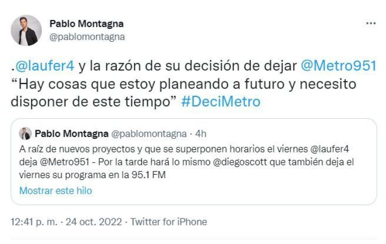 Así lo anunció, en su cuenta de Twitter el periodista Pablo Montagna: "A raíz de nuevos proyectos y que se superponen horarios el viernes Laurita Fernández deja Metro95.1". A su vez, añadió la confirmación de Laurita: "Hay cosas que estoy planeando a futuro y necesito disponer de este tiempo".
