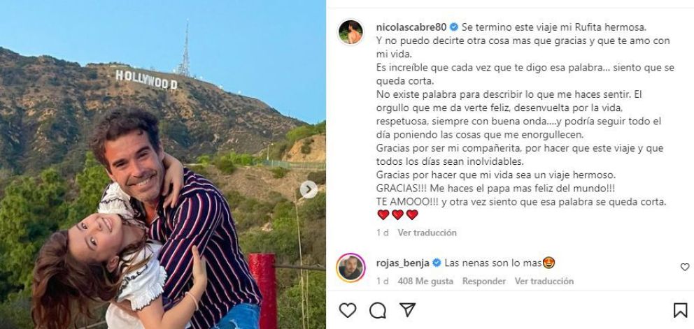 Nicolás Cabre compartió en su cuenta de Instagram una postal de sus vacaciones en Los Ángeles junto a su hija Rufina y le dedicó unas tiernas palabras. “El orgullo que me da verte feliz”, expresó.