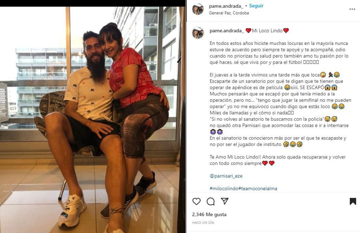 Asimismo, Pamela agregó: "Muchos pensarán que se escapó porque tenía miedo a la operación, pero no… 'Tengo que jugar la semifinal no me pueden operar'. Yo no me equivoco cuando digo que estás loco". Pero la historia no terminó ahí: "Miles de llamadas, y él como si nada. 'Si no volvés al sanatorio te buscamos con la policía'. No quedó otra Parnisari que acomodar las cosas e ir a internarse. En el sanatorio te conocieron más por ser el que te escapaste y no por ser el jugador de Instituto".