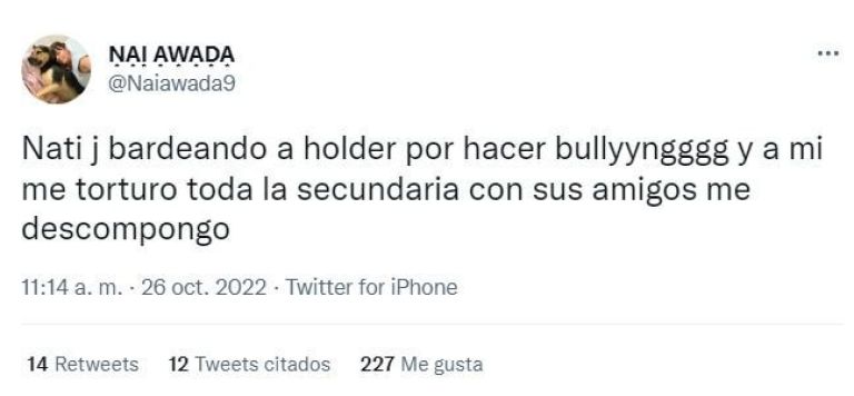 En ese contexto, Nai awada salió en redes con los tapones de punta contra Nati, en su cuenta de Twitter: "Nati J bardeando a Holder por hacer bullying y a mí me torturo toda la secundaria con sus amigos me descompongo”.